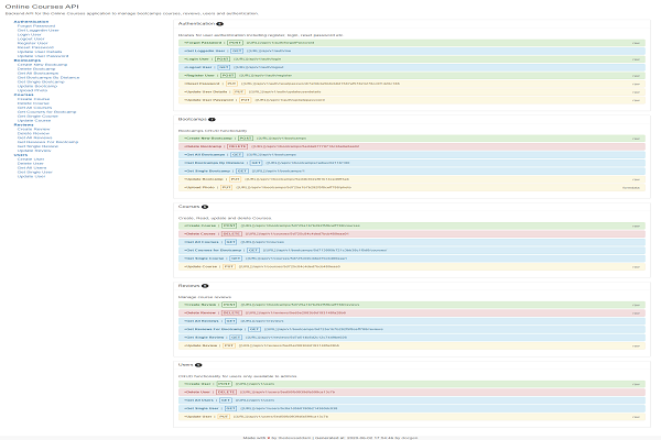 Backend API for the Online Courses application to manage bootcamps courses, reviews, users and authentication.